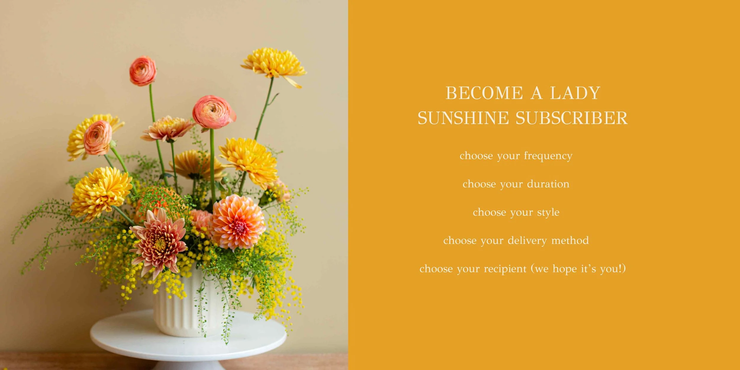 All subscriptions are seasonal and designer’s choice. For instance, during the holidays you’ll receive arrangements with festive blooms that are best and most beautiful at that time.